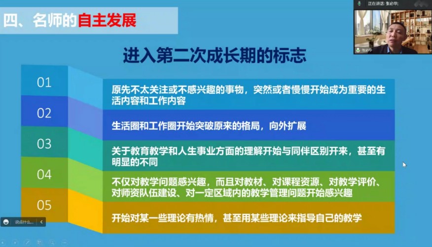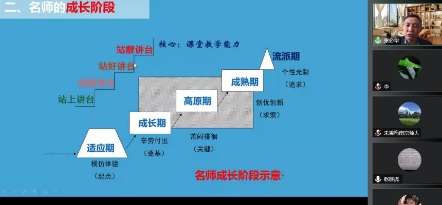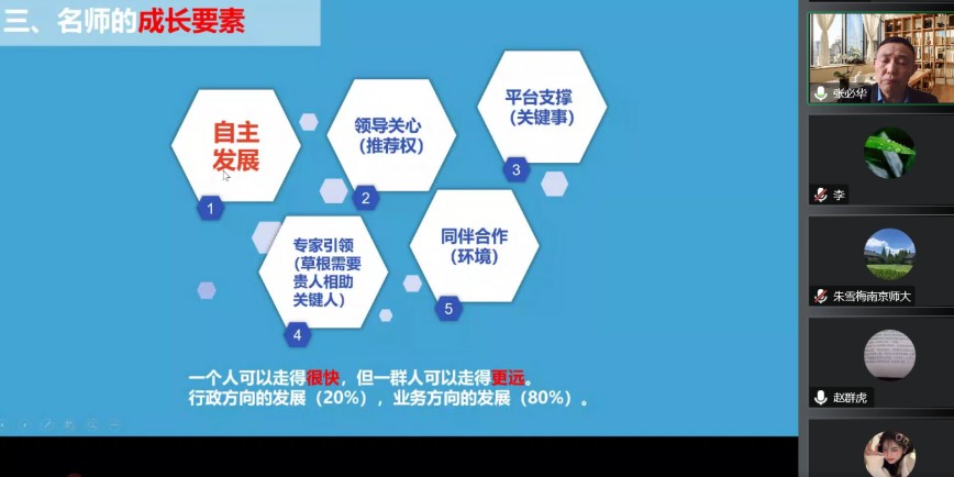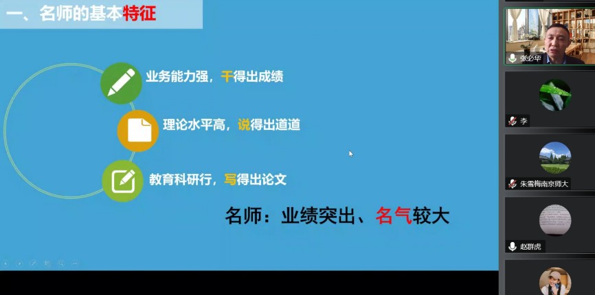 张必华教授是正高级中学高级教师,江苏省特级教师,苏州市高中数学名师共同体领衔人,教育部教研共同体项目张必华名师团队负责人。本次讲座主要包含五大内容:名师的基本特征、名师的成长阶段、名师的成长要素、名师的自主发展和建议。
