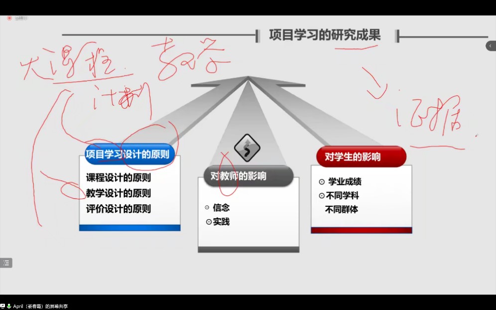 接着,綦老师从三个方面介绍了项目学习的研究成果,分别是项目学习设计的核心原则、项目学习对于教师的信念和实践的影响、项目学习对学生学习的影