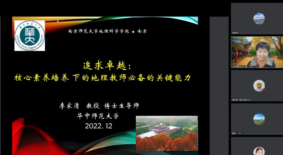 特邀华中师范大学城市与环境科学学院教授、博士生导师李家清以线上讲座的形式,带来了“追求卓越:核心素养培养下地理教师必备的关键能力”的讲座。本次讲座由教师院朱雪梅教授主持,腾讯会议室满员,有许多师生遗憾不能及时参与直播活动,只能观看回放。