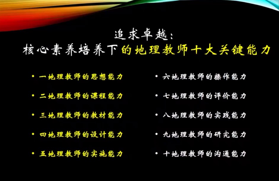 本次讲座李家清教授主要讲述了在新课程改革的背景下,为培养学生的核心素养,地理教师应该具备哪些关键能力。李家清教授提出了十点关键能力,分别是地理教师的思维能力、课程能力、教材能力、设计能力、实施能力、操作能力、评价能力、实践能力、研究能力和沟通能力。