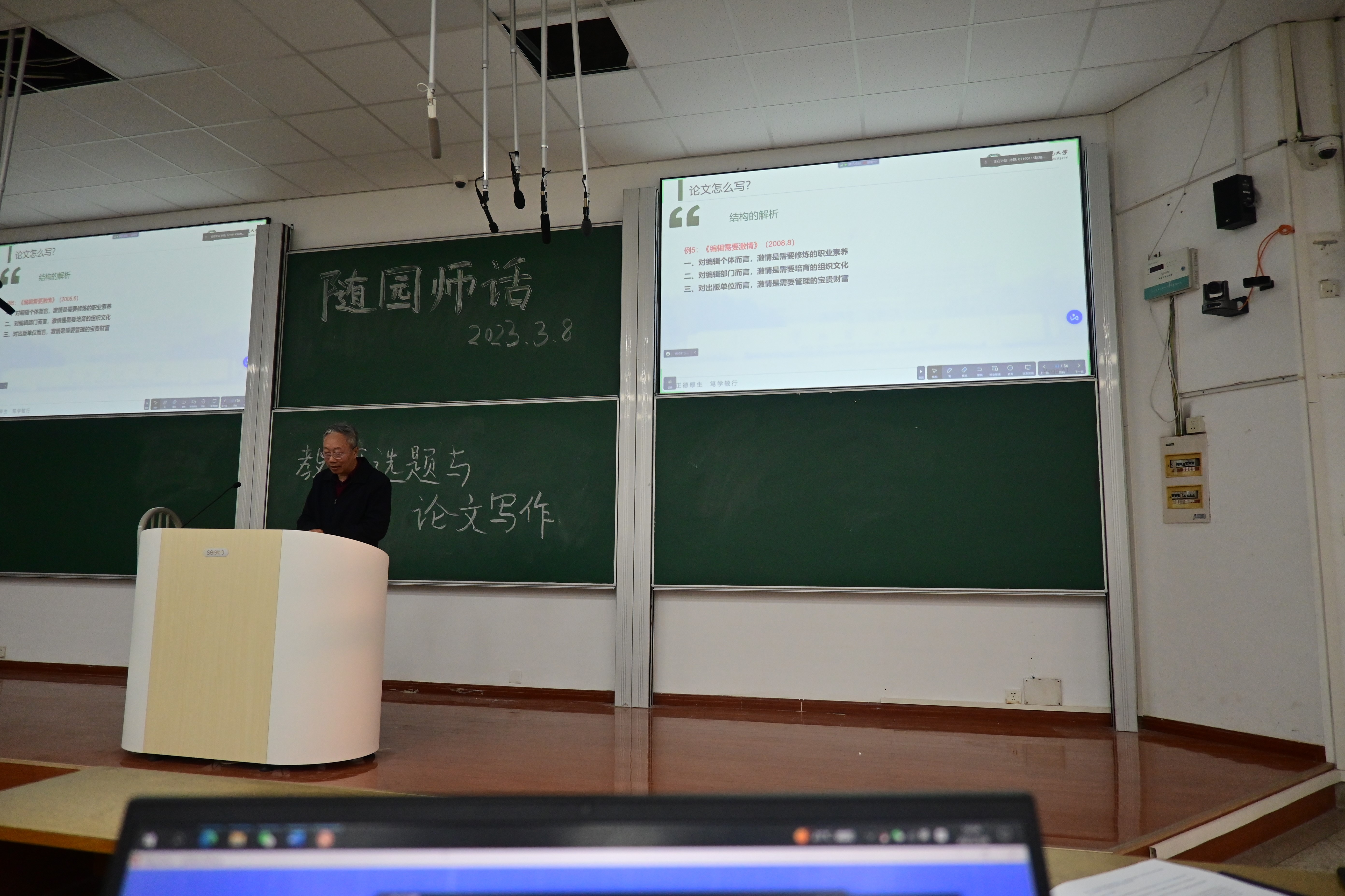 物理科学与技术学院原党委书记、硕士生导师,南京大学信息管理学院出版专业硕士兼职导师,南京物理学会理事长,《物理之友》副主编周海忠教授为同学们带来了题为《教研选题与论文写作——从且行且思到能琢能磨》的专题讲座。