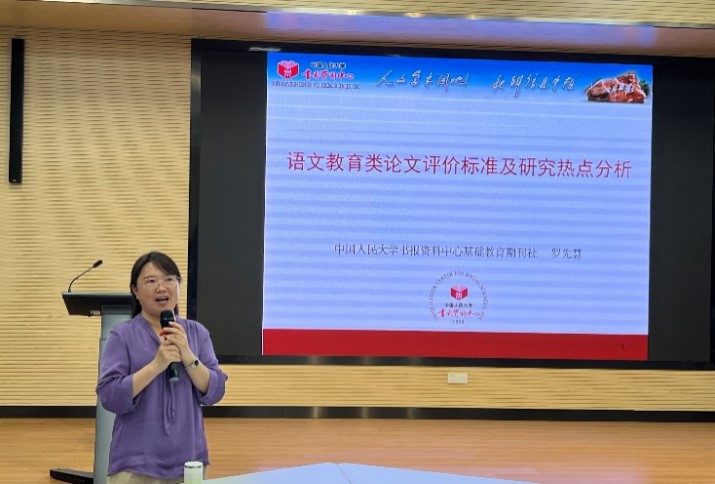 2023年5月19日晚,中国人民大学书报资料中心基础教育期刊社语文学科室罗先慧主任为同学们带来《语文教育类论文评价标准及研究热点分析》专题讲座。罗主任作为中国高等教育学会语文教育专业委员会常务理事,主要研究方向为中小学语文教育教学及教师专业发展,本次讲座重点阐释三本语文刊的选稿标准,并且结合新课标内容及一线教学实际,分析未来研究热点和论文选题方向,学生们都受益匪浅。