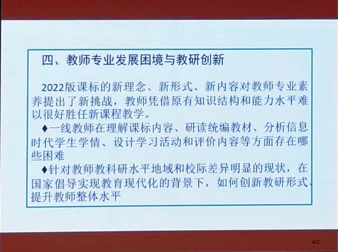 随后,罗主任分析了当前初中语文教育教学研究热点以及最新论文选题方向,对2022版新课标进行了再一次的深入解读。就“核心素养”、“学习任务群解读与教学实施”“素养导向的学科新知识开发与运用”“教师专业发展困境与教研创新”“学生语文学习心理分析”“基于学业质量标准的评价”“中外语文学科比较研究”七个方面进行了阐述和分析。罗主任总结到这七个问题是从事语文教育工作者所要共同完成的建设性的工程,研究生们要以积极的姿态投身语文教育之中。中国人民大学书报资料中心坚持以传播前沿学术为己任,为广大的语文教育工作者输送源泉。