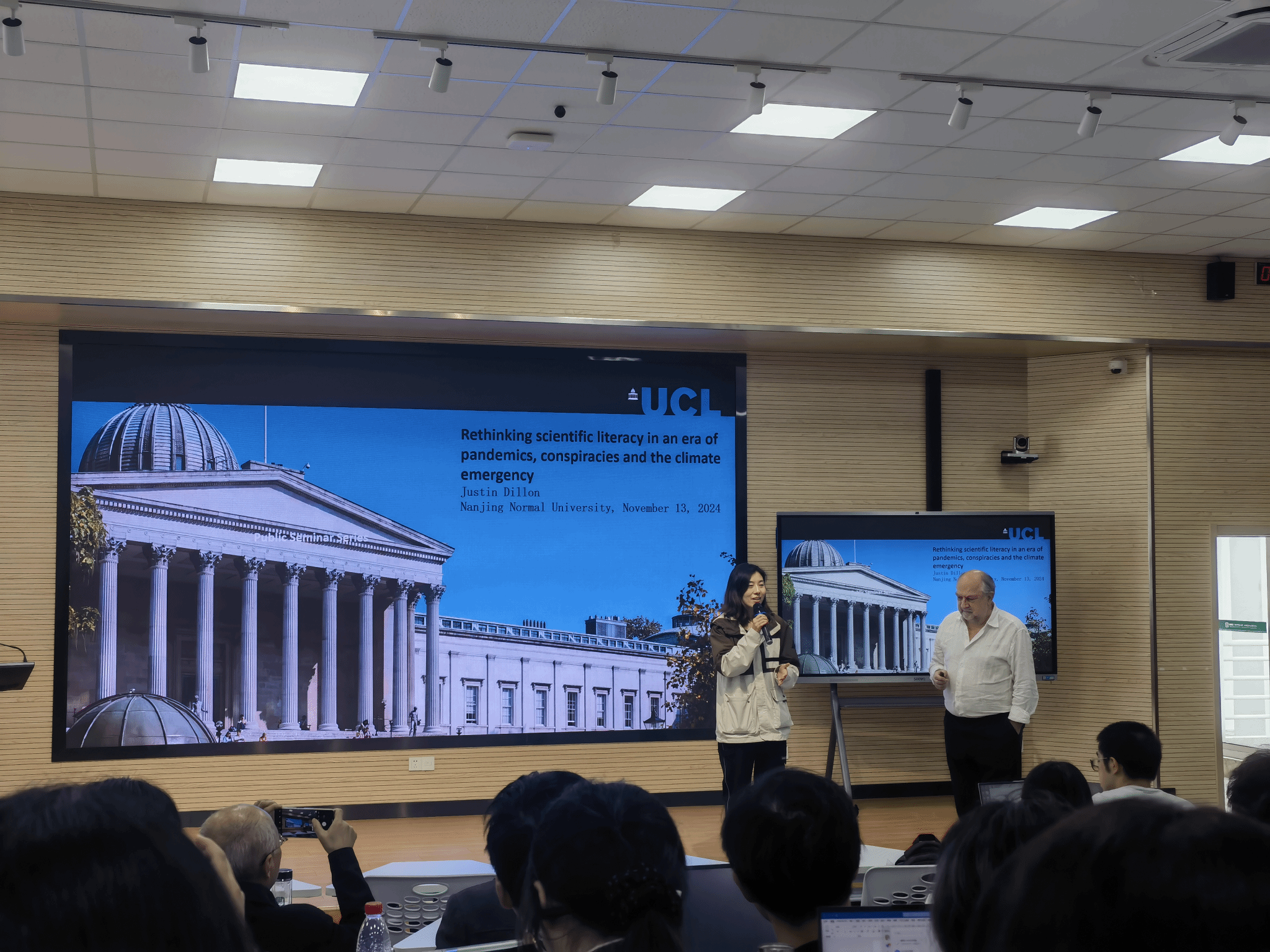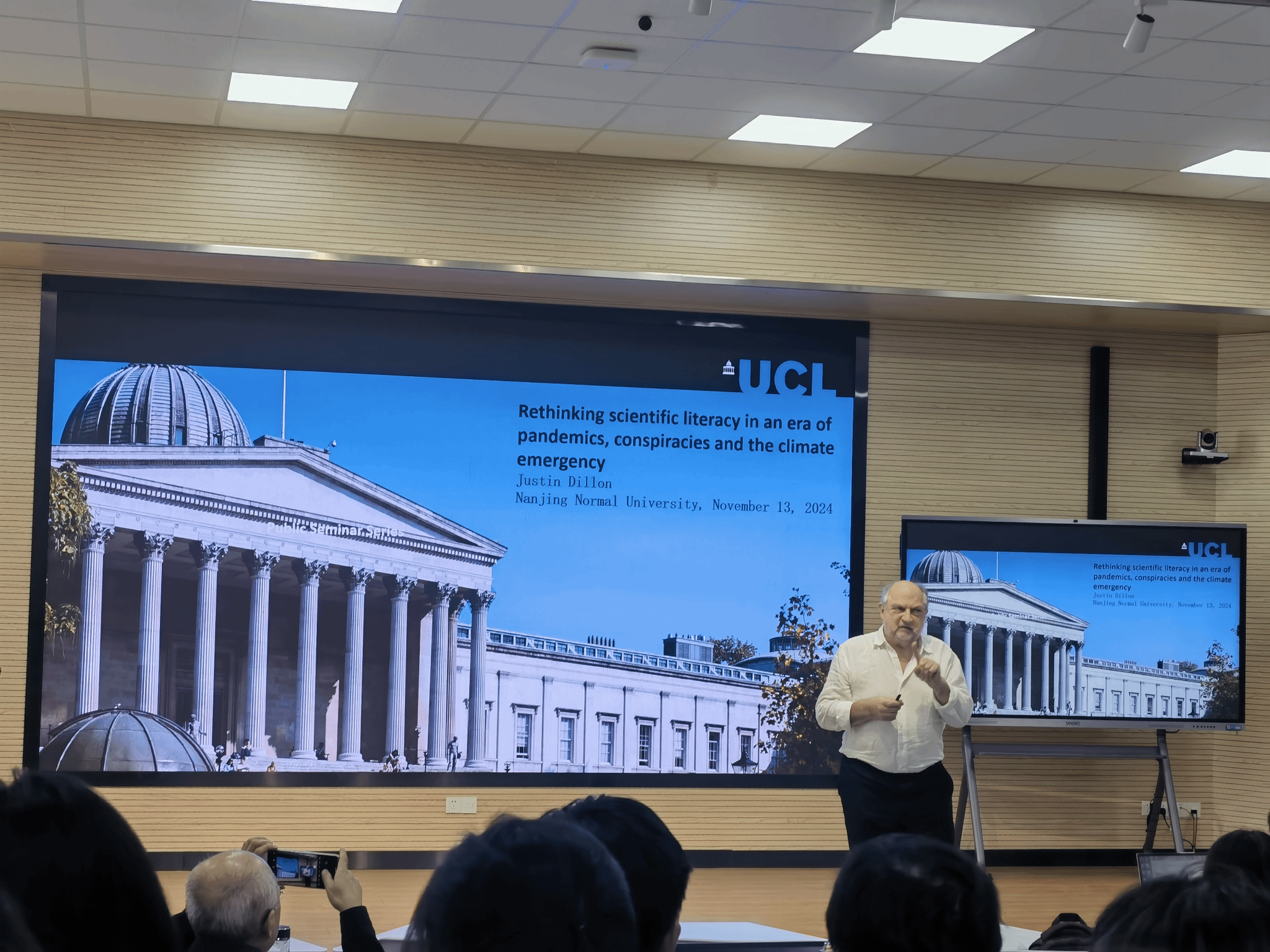 仙林校区学明楼502教室开展了以“重思‘科学素养’:在全球疫情、阴谋论、气候危机的时代”为题的学术分享。龚倩老师、张景璐老师组织本次讲座,张景璐老师主持了讲座并对Justin Dillon教授的到来表示热烈欢迎。吴伟老师、许立新老师、地理科学(师范)专业本科生、物理科学(师范)专业本科生、学科教学(地理)专业及学科教学(物理)专业研究生等百余名师生参加了本次活动。