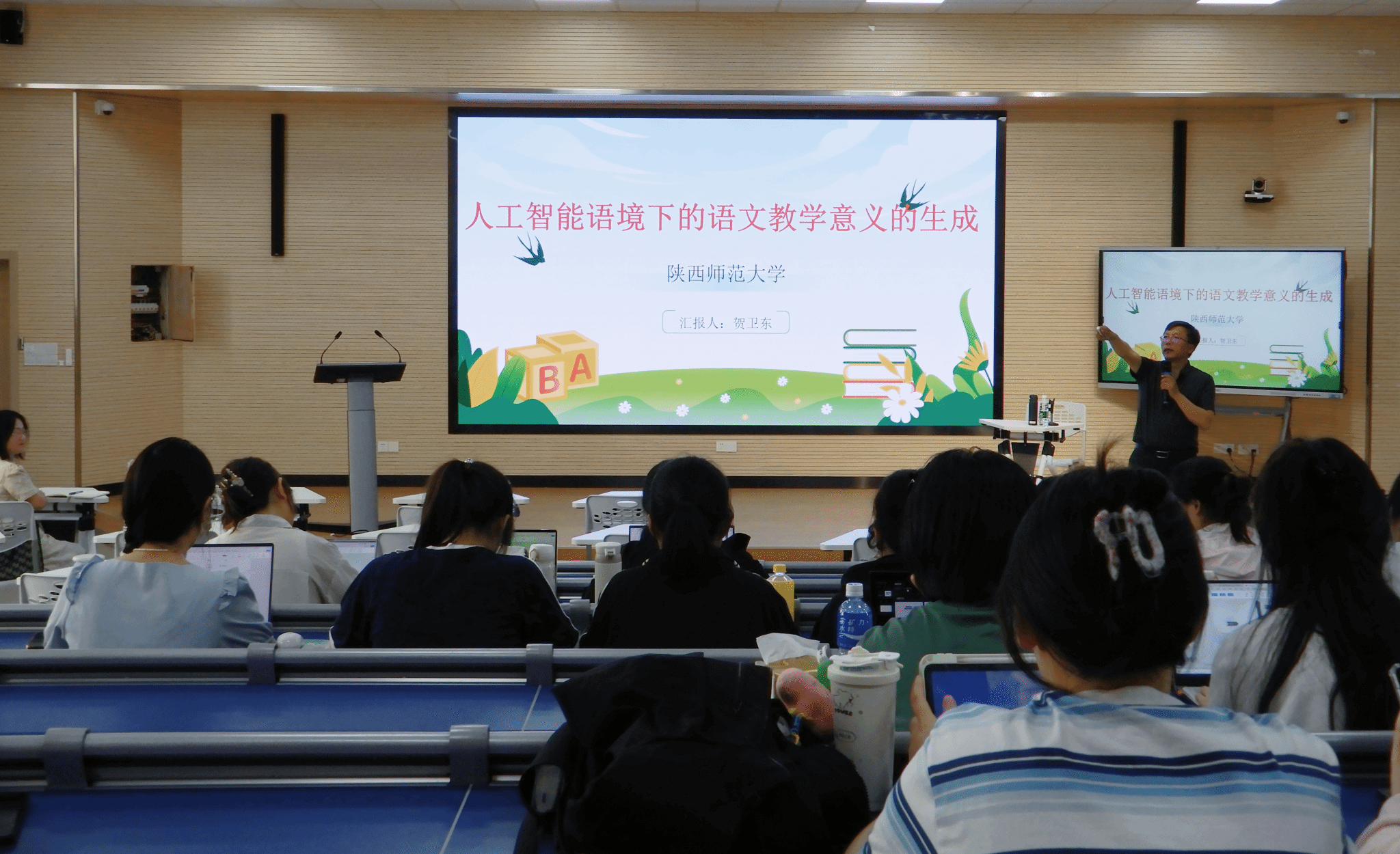 杨霞教授主持,陕西师范大学贺卫东教授担任主讲人,2024 级学科教学(语文)专业全体学生参与,共同探索人工智能与语文教学的深度融合。