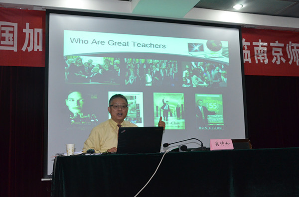 报告伊始,吴仲和教授介绍了美国教育的特点及美国教师的社会地位。美国教育的连续性、透明性很强,学生能很快地把在学校里学到的知识和生活实际联系起来;美国社会特别注重教育公平化,联邦政府会根据每个学校的ELL(English Language Learner)和残障学生所占的百分比给予补助;美国教育政策非常全面,总统、国会、教育局、学校环环相扣。在美国,教师职业的地位要高于律师和医生,教师的收入在全社会中处于中等偏上水平,且福利待遇丰厚。关于美国教师的素养,吴仲和教授认为有四个词贯穿始终:“positive(乐观的),respective(尊重的),faithful(诚信的),searching(探索的)”,即教师始终要向学生传递正能量,例如:“Yes,I can!”“Yes,you can do it.”等。在此基础上,教师的聚焦点就转向“role,procedure,sanction,reward”这几个方面。