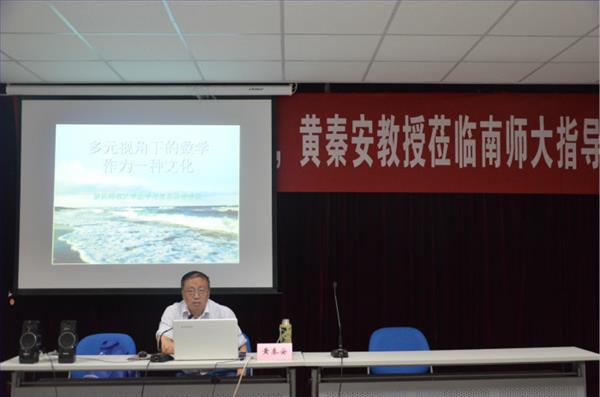 第二场讲座由黄秦安教授主讲,黄教授的主要研究方向为数学教育、数学文化和数学哲学,立足于自己的专业背景,黄教授与大家分享了他在“多视角下的数学作为一种文化”的探索及发现。近年来,“数学文化”在学术界和教育界掀起了一股不小的浪潮,甚至有人认为未来的高考试卷将出现与此相关的题目,因此,对“数学文化”的正确认识正在成为数学教育专业研究生的专业素养的重要组成部分。首先,黄教授探讨了数学文化的基本理论特征,从黄教授的报告中,我们可以知道数学是传播人类思想的一种基本方式,数学是一个具有进化机制的科学生物体,数学具有科学与人文的双重学科性质和精神价值,数学是一个以理性认识为主体的具有强烈认识功能的思想方法结构,等等。随后,黄教授分别介绍了自然科学、柏拉图主义、逻辑主义、人文主义、解释学、形式主义、结构主义、建构主义等视域下的数学理解,为在座的硕士研究生学习数学、探究数学教育提供了极其丰富的认识视角。出于学术探讨的愿望,黄教授主动为大家提供了互动交流的时间,在与同学们互动的过程中真诚地传递出了对中小学数学教师开展教学活动时葆有哲学思维的希望。