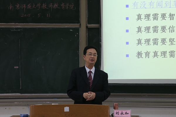 讲座刚开始,刘永和所长就以苏格拉底“闻苹果”的教育故事为例,生动幽默地讲述了从一个假苹果到几乎每个学生都肯定闻到苹果的香味的故事,其结果发人深省,提出真理需要坚持、智慧、信念和教育科研。接着刘所长就目前教育方式的改革提出自己的思考:教师的教应当是第一位的,决定了学生的学习质量和发展。对于研究性学习和探究性学习也不能盲目推崇,要看到其弊端:思维训练的断断续续,不利于学生思维培养,同时损伤班级行政性,效率低,不能保证质量且浪费时间。随后刘所长进一步指出教师应当做一个能思想的人,而教师积极做教育课题则能锻炼思想能力,在课题的确定方面,刘所长建议大家从教育目标、教育现象、教育方法和教育经验入手,寻找课题。刘所长以南师附校陆一鹏校长独创的“考试备忘录”为例,让学生自主课后复习、课后梳理来自主掌握学习的方法,叙事过程妙语连珠、风趣幽默,在引得同学们哈哈大笑的同时也启发同学们对教育问题、教育方法的思考。讲座最后,刘所长以日本著名的童谣诗人金子美玲写的一首《我和小鸟和铃铛》结束了本次讲座,这首小诗暗含民族和而不同的理念,也是教育追求的境界。