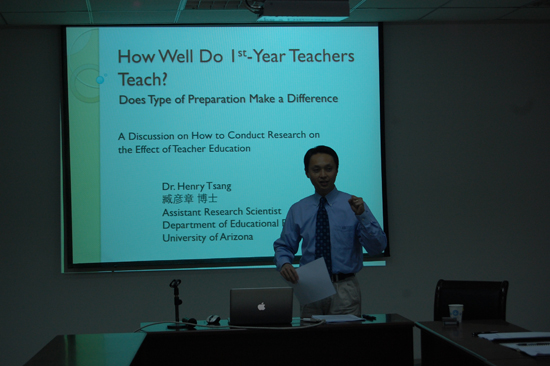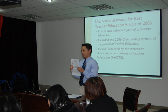 Henry Y Tsang 博士在美国亚利桑那大学获得博士学位,他的主要研究兴趣为课堂教学研究、教师教育课程评价以及中国的高等教育改革研究。讲座开始,Henry 博士首先给大家介绍了美国教师教育研究的状况,提出如何评价新教师的问题,指出目前教育研究中定量研究的比重不足。Henry 博士从classroom-management、implements instruction等维度来设计量化指标进行统计,分析不同因素在培养教师中的差异,深化了同学们对影响新教师因素的思考,同时也加深了同学们对教育问题量化研究方法的认识和了解。
