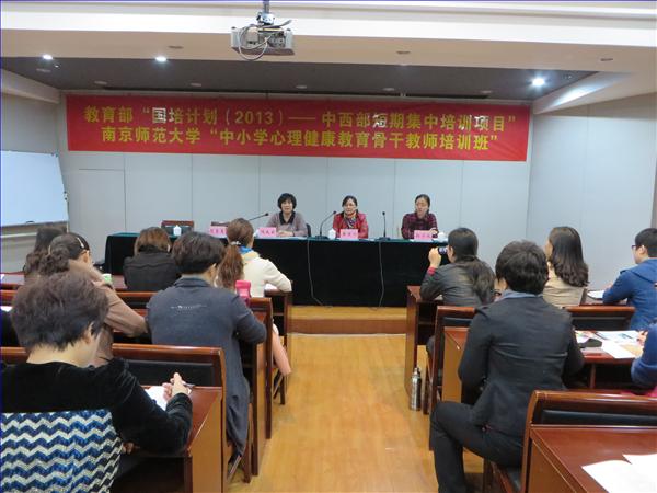 接下来是副院长蒋京川教授为新疆学员解读课程设置以及师资团队。蒋京川副院长指出,为了凸显培训的实效性、互动性以及角色激励,学院对本次国培课程进行了精心规划和设计,主要包括三大模块即基础理论、实务操作和实践环节。学院聘请了全国知名的专家学者前来授课,同时以南师大心理学院为依托,整合了江苏省优质的心理学师资,既有高校从事心理健康教育的教授、博导,也有中学一线的心理健康特级教师。最后,蒋京川老师向学员提出了两点要求:第一是多提问题,第二是勤于思考和乐于表达,希望学员进行积极地交流、互动,相信培训一定会精彩纷呈,学员们一定会学有所获。