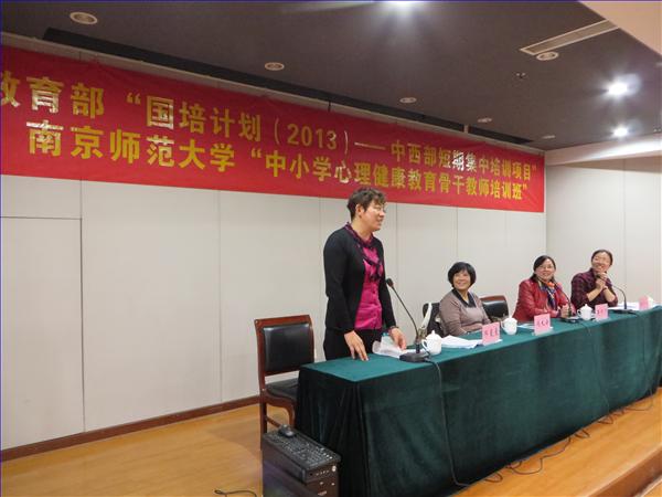 最后新疆乌苏五中德育主任郝新英老师作为学员代表进行发言,她表达了参加这次国培学习的激动心情和对心理健康教育的浓厚兴趣,希望在这次南京之行能收获满满。