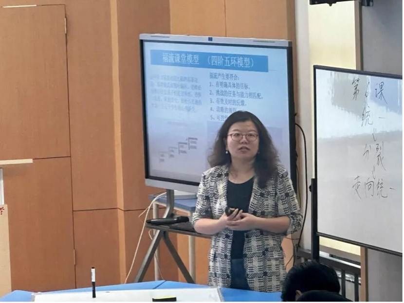 首先,李晓苏老师分享了具有学校特色的福流课堂模式。为促进高中学生在课堂获得积极体验,五中在近年来不断探索完善福流课堂模式。李老师结合她的亲身教学经历,阐述了福流模式在历史课堂与课后的双重应用,与其对于学生学习效率的提升。