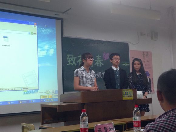 学生会轮值主席张贤和以及24位大众评审组成。今天的决赛评委规定每组选手有三分钟进行视频展示以及解说答辩。选手们制作的视频选取题材各异,有的是展现朋友间美好友谊,有的是纪念班级成立来的点点滴滴,有的是纪录从儿童到青年的发展阶段。这些视频或创意十足;或制作精湛,极好地处理了光与影、音乐和画面的关系。我班金梦、许洁、冯祥、张宇伟组成的小队用视频记录了四人参加“暴走团”走过南京各大高校的足迹,在各高校扮演《致我们终将逝去的青春》中的经典情景,掀起了全场高潮,笑声不断,赢得阵阵掌声。张张照片的闪过,我们见证了四人在美好青春年华中的深厚友谊。最后,加之精彩的答辩赢得了常规组第一名。