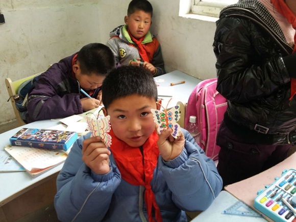 支教活动的第一堂课是手绘工艺课,课程由六名同学共同负责,张欣怡和周瑶主要负责课堂讲解和PPT的展示,赵雪薇和杨越主要负责帮助学生完成手工制作,而曹婷婷和徐能学则是负责课堂秩序的维护。课程的主题是“飞来的蝴蝶”,课程在以蝴蝶为谜底的谜语中缓缓展开,在积极的课堂气氛中,志愿者为同学们展示了多张蝴蝶的照片,给同学们介绍蝴蝶的形状美。色彩美、花纹美,引导同学们了解了蝴蝶的各个部分。在课程的最后,志愿者教习了纸蝴蝶的制作,孩子们都认真地跟着志愿者学习剪纸,遇到不明白的地方时就立刻举手询问,力求成功做对每一步。看着孩子们将自己一节课的成果兴奋地举着四处炫耀、希望得到表扬的小脸时,我们的心里也充满了喜悦。