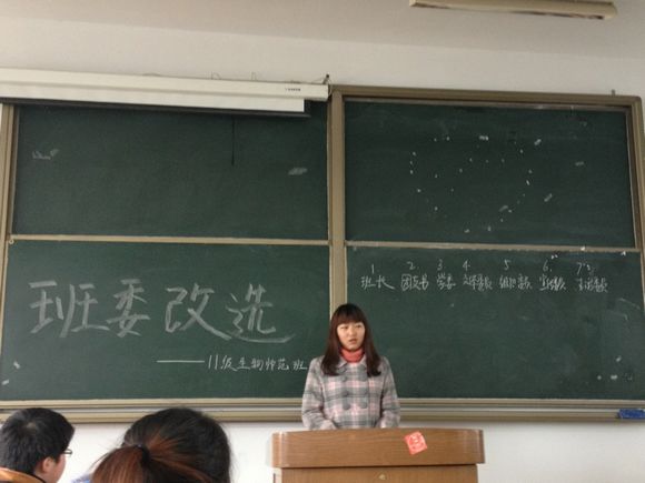 台上如火如荼,台下认真倾听。最后,由班级民主评议会代表对选票进行统计保证了选举的公平公正性。新一届班委人员正式敲定,同学们也对新人班委给予了热烈的掌声。在新一届班委人员中,涌现出了如张文君等4个新面孔。更多的同学参加到了班级建设活动中来,同学们对11级生物师范也有了更深的了解,班级凝聚力也上升到一个新的高度。历时一个多小时的班会活动就此落下帷幕。