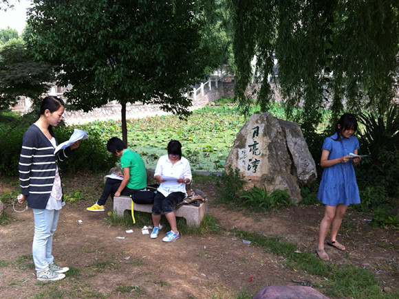 此外,每天早晨6点50分,11级汉语言师范班的同学自发到月亮湾进行晨读。有的吟诵诗歌,有的模拟演讲。通过晨读活动,也强化了同学们的普通话等能力。