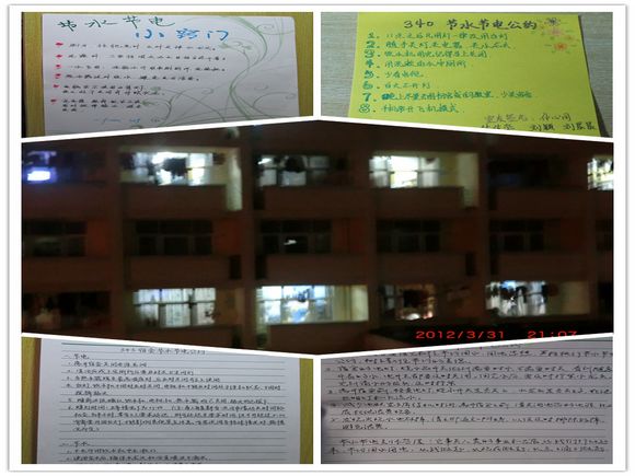 3月31日晚八点整,生物师范班全体同学集聚北区足球场,虽然天色暗淡,但同学们兴致不减。各宿舍同学积极上交《寝室节水节电公约书》,并在公约书中介绍了节水节电小妙招,如洗浴间断放水、谨防“待机能耗”现象、无需强光的过道应安装感应灯、卫生间张贴节约用水、用电标志等;然后兴致勃勃地评选“优秀寝室节水节电公约书”,交流节水节电知识,并提出自己对“地球一小时”的认识;最后在操场进行了有氧慢跑,晚十点整才恋恋不舍地返回了宿舍。