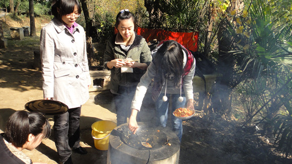 活动之前,班委已将参与活动的同学以每个宿舍为单位随机分为五大组,每组准备做一至两个拿手好菜,并且每组选出了一名负责人,代小组选购本组做菜所需的原材料。在附近的菜场,各组负责人精心挑选好本组做菜所需的食材,班长等班委也准备了一些用以烧烤的原材料供大家共同分享。就这样,在欢声笑语中一行人来到野炊的目的地——朴园。首先,大家按小组领到本组的“锅碗瓢盆”等一系列用具,每组有一张桌、一口灶。很快,大家便开始洗锅、刷碗、洗菜、择菜忙活了起来,一切准备工作做好后,大家便不约而同的开始了最重要的环节——烧菜,纷纷拿出看家的本领,有的切菜,有的生火,有的烧菜,有的打下手,一派繁忙有序,乐在其中的景象。一道菜出锅后,各个小组把它分成五份,大家都恨不得停下手中的活,赶紧尝尝饭菜的鲜美。生物班的女生占到大部分,而负责烧菜的同学的厨艺可谓精湛,饭菜个个不逊色,难分上下,很快就被大家吃光。什么鱼煎豆腐、紫菜鱼丸汤、番茄炒蛋、四季豆炒肉等等,大家往往是在惊喜之中感受到美味的快感。