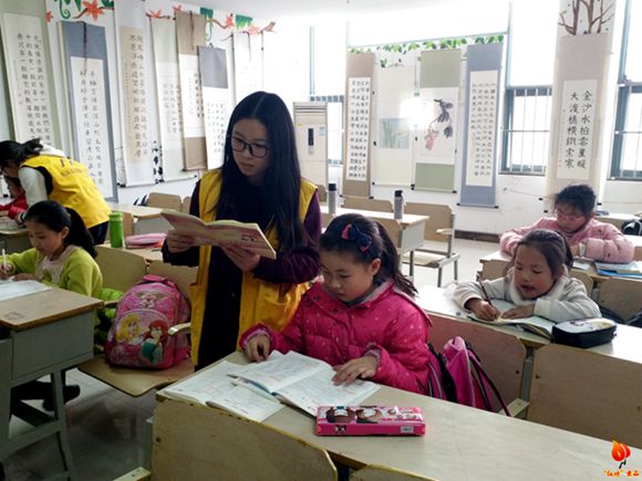 课堂里的孩子多为低年级学生,志愿者对于他们提出的问题显然游刃有余,但教导初学者更需要志愿者们细心的对待。在这方面,志愿者们的努力有目共睹,他们以最简单、形象的语言来解释解题思路,力求既能帮助孩子们解决问题又能记忆下来。除了答疑解惑,志愿者也参与到其他学习任务:检查作业、听写、抽背等等。同时,身为师范生,志愿者们身为人师的责任感和热情油然而生,无微不至地关爱孩子们,有的志愿者细心地给孩子们盛热水,修理笔芯……而在孩子们眼里,这些小老师似乎是万能的,这份信任使得志愿者与孩子们的关系更亲近。