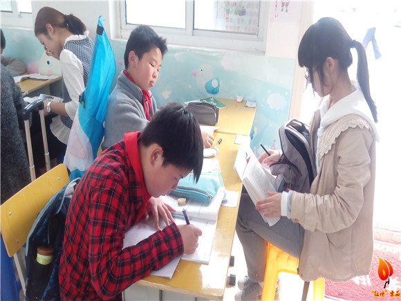 时间过去一个小时左右,高年级的小朋友也放学来到了课堂里,人多了起来自然也热闹了起来,有小朋友向志愿者提问的声音,有志愿者教导小朋友的声音。还有一位小朋友的奶奶也坐在教室里帮孙子检查作业,发现可能有错的会向志愿者提问,得到回答后再让小朋友改正。