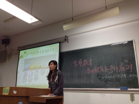 本次心理小讲堂的主题为生命教育与心理危机事件应对,首先郭淳同学为大家带来与珍惜生命有关的内容,通过一段视频让大家了解高校近期发生的安全事故,指出要做好危机干预工作。接着,刘梦琦同学为大家展示一些有关大学生自杀问题的调查数据,从这些数据中明显反映大学生普遍存在心理问题,她从外部原因与内部原因对此进行分析,同时她也通过一个小测试来测试大家的自杀倾向与死亡态度,在座的同学们都感到十分有趣。然后,章衍同学为大家介绍自杀高危人群的表现与自杀前的倾向,他提出“如果感到身边有人有自杀征兆你会怎么做”的问题给在场的同学思考,同学们积极参与并提出许多较好的建议,接下来,他要求同学们在白纸上画下房子、树和人,借此测试同学们最近的心理状态。最后,由王玥同学带领大家了解学生心理问题的诱因,并给出应对心理问题的办法,使每个人都对心理问题的解决有一定的认识,令同学们受益匪浅。