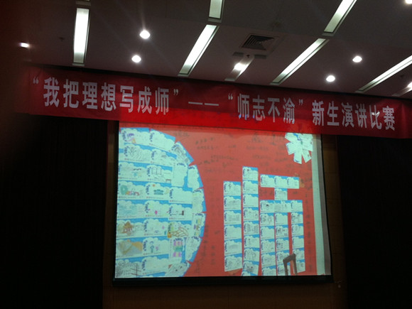 同时,在本次比赛进行中还穿插了由教师院新生带来的精彩的励志歌曲串烧,歌唱出了所有人追逐理想的执着与热情。随后还有别出心裁的班级视频欣赏和各班“班级理想盒、展板”展示,呈现了12级新生在步入南师大的两个多月里丰富充实的校园生活和逐梦瞬间。